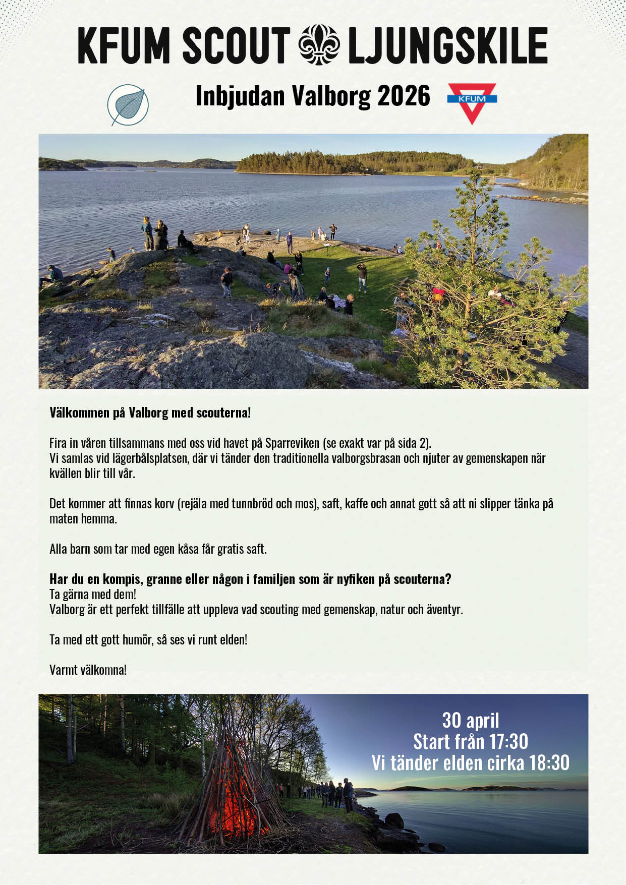Start: Från 17:30Brasan tänds ca: 18:30Plats: SparrevikenMat: Tunnbrödrullar, kaffe, saft och lite annat gott